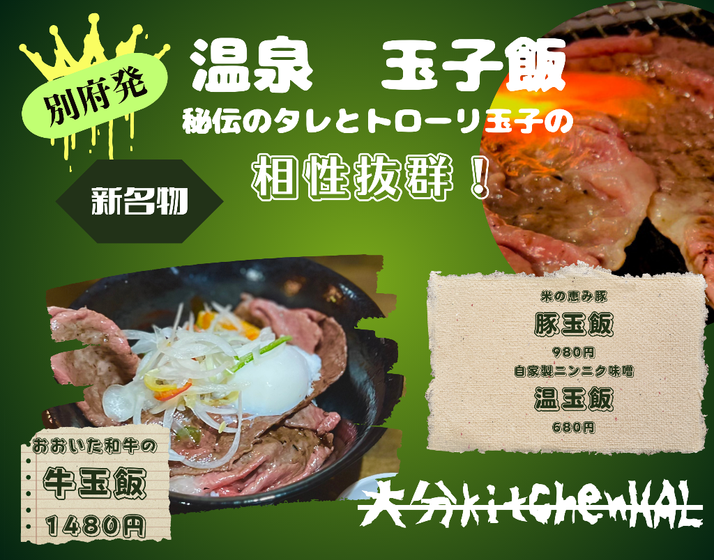 温泉卵飯は豪快におおいた和牛を乗せた牛玉飯や、米の恵み豚ロースの豚玉飯など、一度たべたらやみつきになります!
